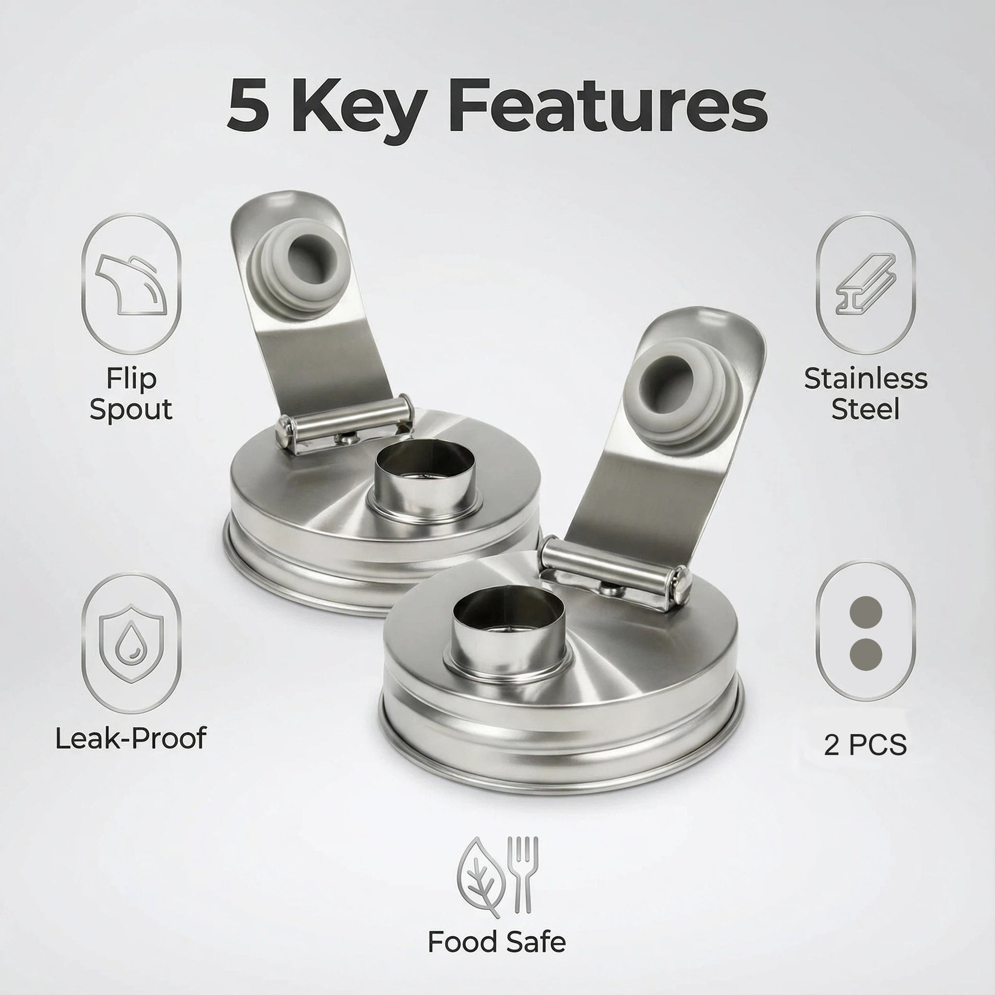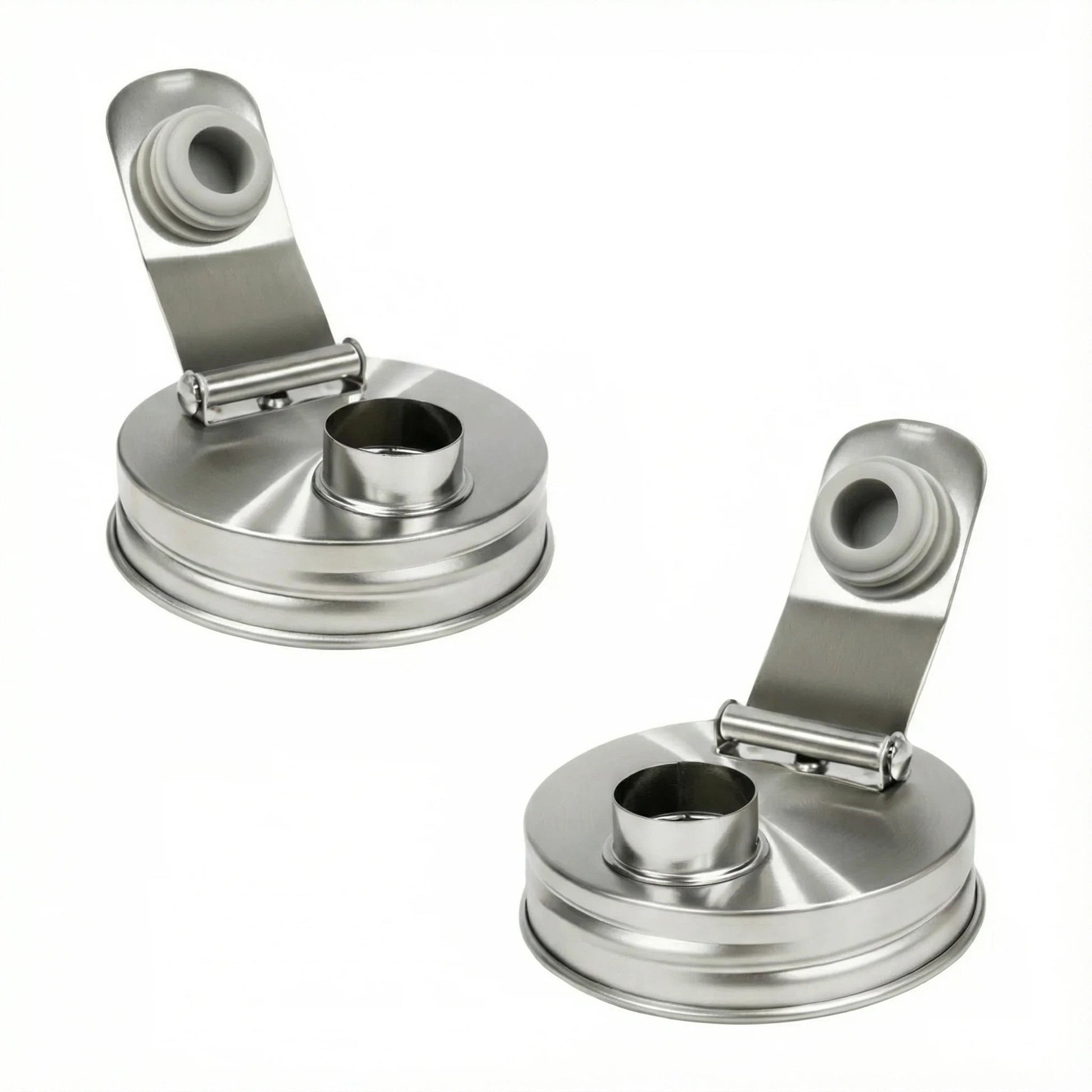Package Includes: 2Pcs Stainless Steel Pour Spout Lids with Silicone Seals.