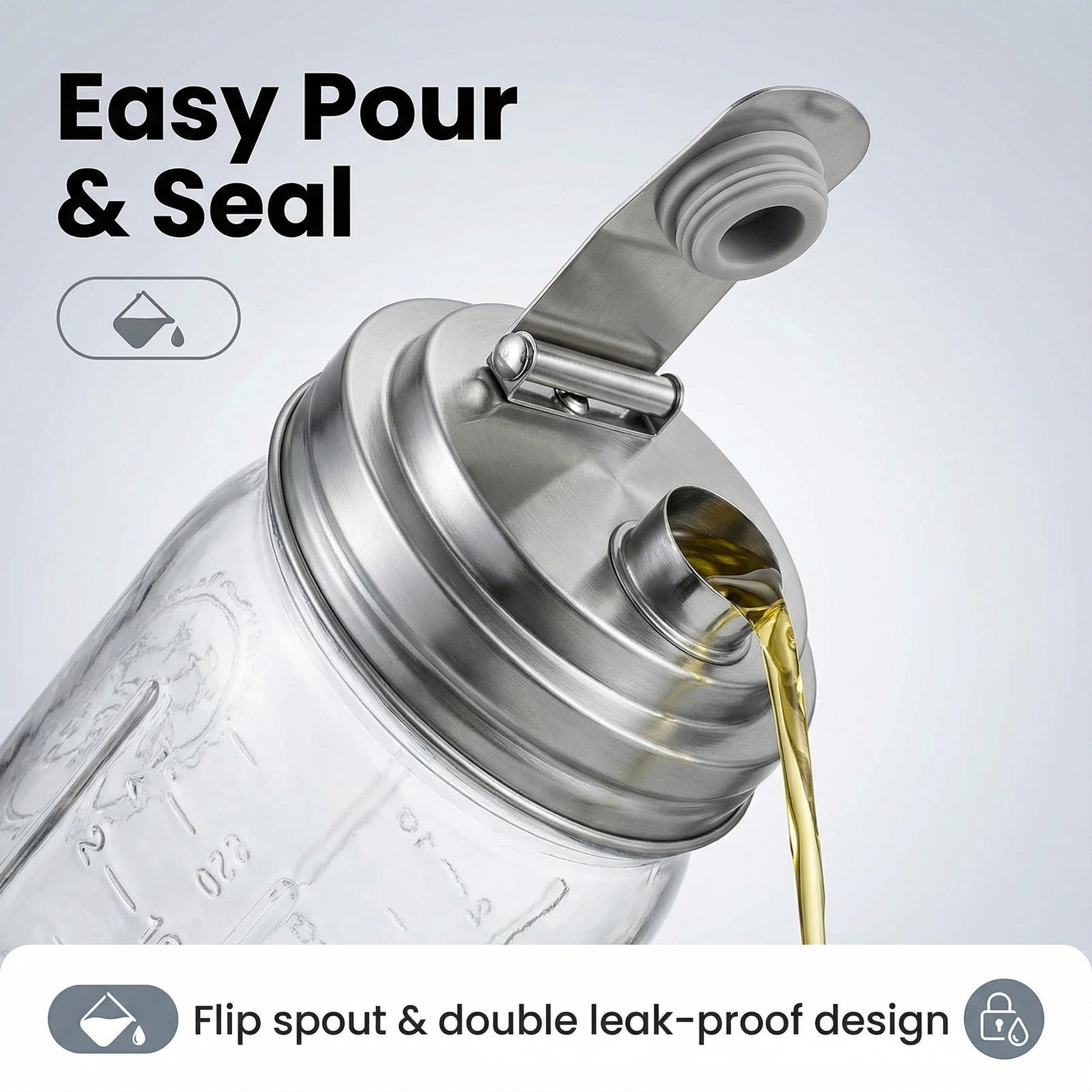 - Perfect Pour & Secure Seal: Features a flip-top cap with a fully silicone-plugged spout. This design ensures a leak-proof and airtight seal, preventing spills even when the jar is inverted. Ideal for storing and neatly pouring liquids like oils, dressings, pancake batter, and dry goods.
